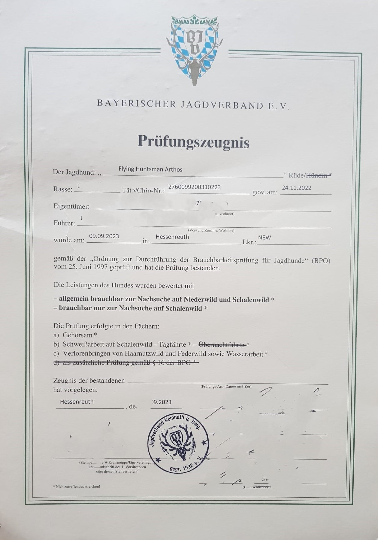 Deswegen freue ich mich sehr, dass Flying Huntsman Arthos die volle jagdliche Brauchbarkeit Bayern mit übernacht Schweiß hervorragend bestanden hat.