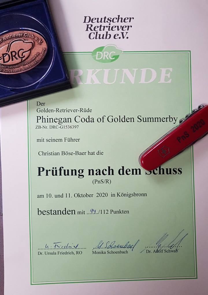 Somit ist mein Phinegean der fünfte Golden überhaupt, der diese Vereinsprüfung nach dem Schuss bestanden hat. Bei den Goldens ist er der zweit beste und im Gesamtranking immerhin 10. bester Hund.